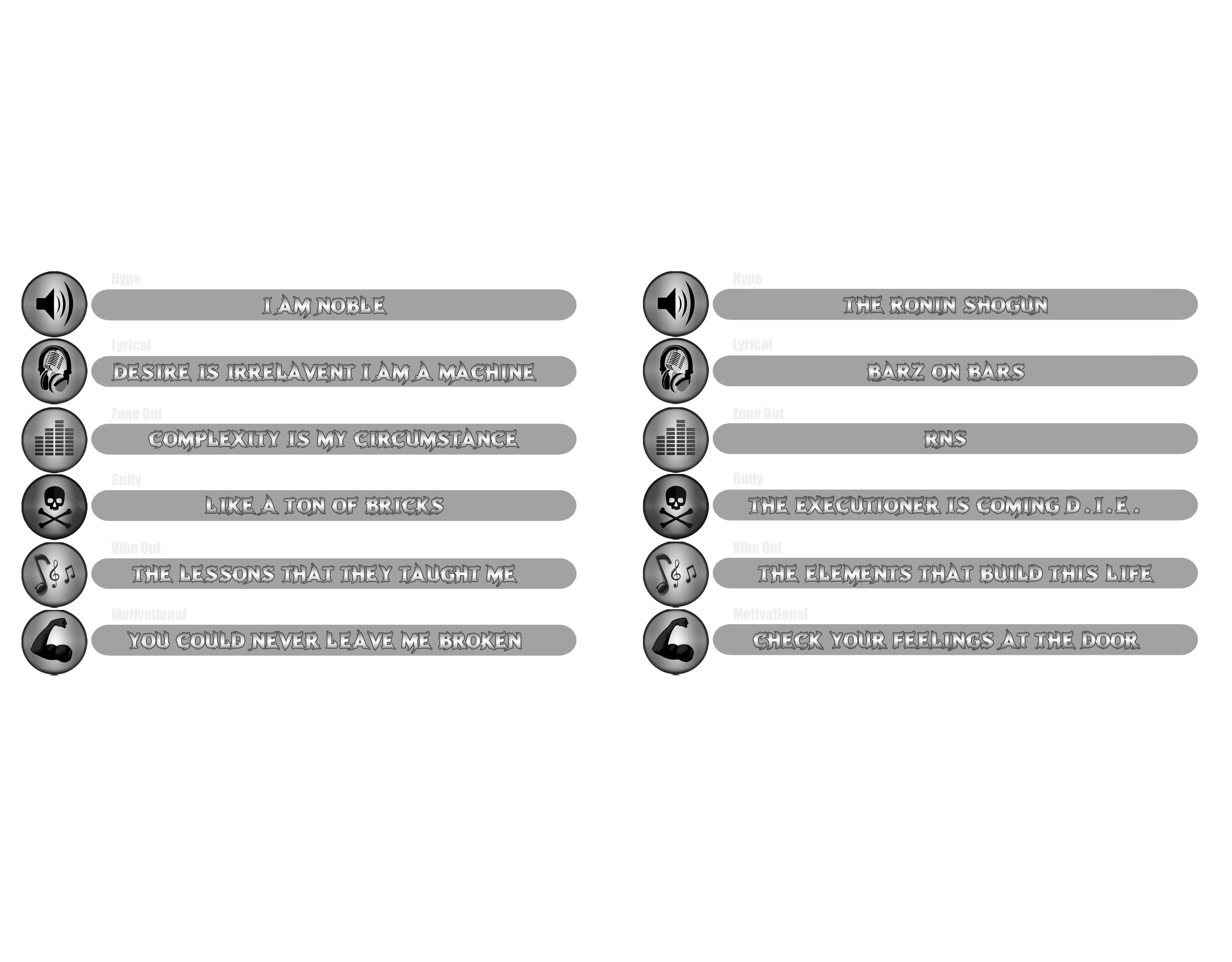 The Unlimited Paths Zero: Categories of CircumstanceThere are infinite and unlimited paths that a warrior artist must travel. Each one must fall, under one of the six categories, of circumstance.LISTEN >T-SHIRT (Amazon)I am NobleThrough chaos and shadow, Noble moves with a king’s grace, shielding his tribe and wielding rhymes sharper than steel. Even in peril, his artistry reigns supreme.